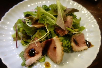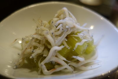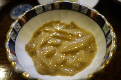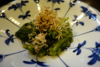 フキ、鴨サラダ、イカの塩辛、菜の花からしあえなどいろいろ出していただきました!一緒にいただくお酒は、、、市販されていない中国醸造さんの雫酒!もう、最高においしかったです!