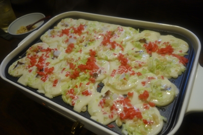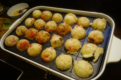 ここでたこ焼きパーティーがはじまります!たこ焼きを焼いたことがある私がまず焼き始めます。最初の一回目はたっぷり油をひいておかないとこげちゃいますからね~!紅しょうがもたっぷりいれちゃいます!出来上がってきたたこ焼きからはとってもおいしそうな香りが!う~ん、おいしそう!