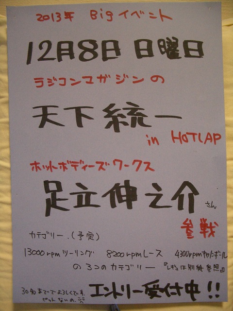 こんばんはー HOTLAPですー毎月発売が楽しみな ラジコンマガジンさんより ご連絡あり天下統一レース!!2回目ーー今回は 足立伸之介さん ご来店 ホットボディーズワークス なのでTCXXツーリングカーの すごい走りと対戦だーサイクロンシリーズお持ちの方ー 車の作りかた セッティング 聞きましょうまだ 打ち合わせすんでないので 確定ではないのですが足立さん ミソ加藤さんと 走りたいけど 速いのはキビしい との声もですので 3段回の スピード域で 13000rpmツーリング 8200rpmクラス 5000rpmキャノンボールの 3カテゴリーで いきたいと考えてます5000rpmキャノンボール とは? 4300rpmキャノンボールを ちょっとルール変更で人気の TTカップの車と 同じ速度に 合せさせていただいたカテゴリーですほんの少し 速度あがりました11月24日 日曜日のレースから よろしくお願いいたします13000rpm や 5000rpmとゆうのは HOTLAPオリジナルの車検機での測定の 最大回転規制値です 実走状態で測定できるので 回転さえあわせればタイヤ径が違っても モーター、ギヤ比が違っても 速度を合わせれるのが 特徴です最近では ヨコモGT500選手権でも タイヤの回転数を測る車検になってますね世間に 認められてきたかな? 実走車検方式(゚∀゚ )天下統一イベント RC雑誌 ラジコンマガジンに カラーで載りますよー集まってくださいー 参加してくださいー 足立伸之介 見れますよーうちは ピットがそこそこの広さなので 予備ピット使っても 30名がギリギリ事前エントリーの ご連絡 よろしくお願いしますあと 12月で HOTLAP 5周年でございますいいとこに いいビックイベント来てくれたー ありがたいことですしかーーし 12月8日 ばかり目立ってはいけませぬ来週 11月24日 日曜日 お昼のレースがありますー13000rpm 8200rpm 5000rpm 1/12レーシングGT500ストック の 5つのカテゴリー天下統一の 前哨戦っぽいね集まってくださいー 11月の お昼 いい気候でRCで遊ぶ事前エントリー受付中ー 当日エントリーも もちろんOKよろしくねまた 明日も遊びましょーー