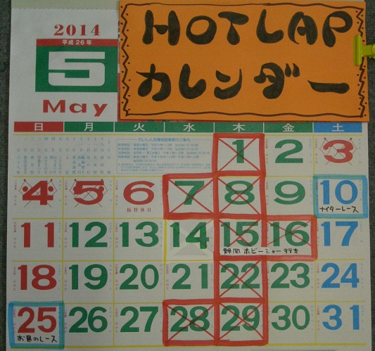 こんばんはー ゴールデンウィークですねー明日から 5月カレンダー 見てね10日に ナイターレースが開催ですーカテゴリー は ちょっとお待ちください4つ で いこうと思ってます すいません16日は 金曜日ですが お休みいただいて ホビーショーに行きます4PXプロポを 生で見たい TBエボ6を 見たいハイテックブースに行きたい さわやかハンバーグ食べたい新幹線に乗りたい です25日は お昼のレースがございます また詳しく 書きますねご連絡ーーー 月曜日に HOTLAPレンタルポンダー の 3番 持って帰っちゃったも〇〇〇さん 返してね よろしくお願いします