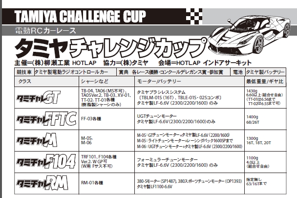こんにちはー HOTLAPですー明日は お昼に タミチャレがございますー申し込み用紙だけでは わからないとこありますね書きますねコースは 10時前くらいから 利用していただけますー11時に お店オープン オープン前からでも 走行どうぞ25日締切と書いてありますが 当日エントリー もちろんOK ですトランスポンダーご用意ください と書いてありますが 無料レンタルありますーあと 路面保護のため グリップ剤の使用も 認めています(マイティ黄色推奨)1時ちょい過ぎスタート 6時前には 終わりますF1クラスは スポンジタイヤの方が 大半です参加賞 タミヤさんの景品(今回もすごいよー) メイン優勝賞品でますーよろしくね 楽しみましょうガンガン集まってくださいー