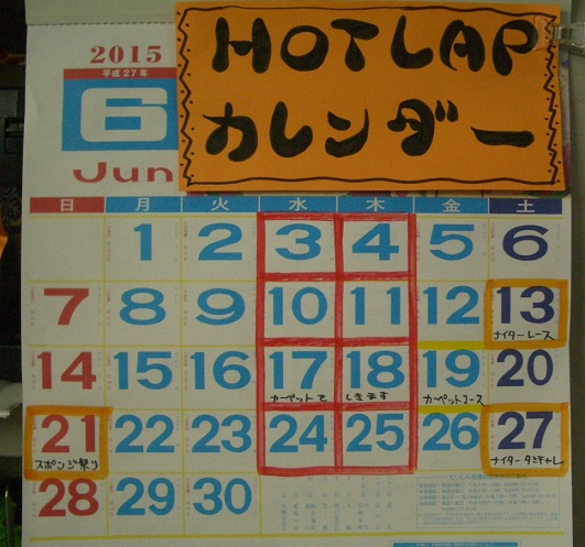 こんばんはー HOTLAP 6月のカレンダー 見てくださいね 6月 暑すぎます もう アスファルトの限界時期がやってきました17 18日で カーペット敷きします 19日 (金曜日)より涼しくなるまで カーペットコースにさせていただきますアスファルト路面保護のため ご協力よろしくお願い致します13日(土曜日は) アスファルトでの ナイターレースカテゴリーは 4つTTカップ GT500ストック Mクラス シティコネクションですスタートは 7時くらいよろしくね19日より カーペットコース20日 土曜日 夕方 5時より 1/12レーシングの貸切となり21日 暑いぜ 夏だ 敷いたばっかだ スポンジ祭り1が 開催でございます まさかの お昼イベントちょっとでも 涼しいこと祈ってます1時すぎスタートです モデファイと ストックのカテゴリー よろしくねヨコモ 30,5Tモーターが 入ってくれば 新カテゴリーの30,5Tライトストックもやりたいのですが モーターきません(~_~;)吉岡くん がんばってそして 同じ週 27日 土曜日 ナイタータミチャレが開催代表権付き! カーペット! こちらも よろしくお願い致します今年は カーペットコースでの ツーリングカー走行も 推していこうと思っていますハイサイド防止の方法もいろいろ覚えたことですし 楽しんで頂けるようタイヤもご用意しておきますね よろしくね