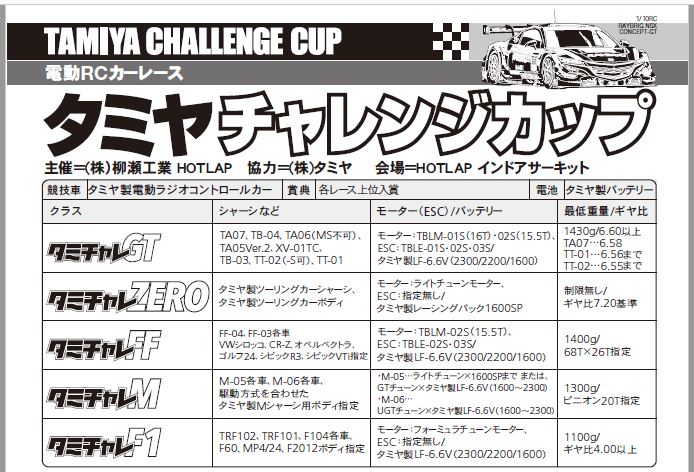 こんばんはー HOTLAPですー8月28日 日曜日 タミチャレがございますー早始まりで お昼のレースになります代表権付きタミチャレで 6つのカテゴリーがあります07も速いぜ タミチャレGTカーペットタイヤも使用可能 タミチャレFF唯一のスポンジカテゴリー F1 (Aスポンジタイヤのみ)前輪駆動 VS 後輪駆動 Mクラス人気UP タミチャレZERO (今回よりバッテリー リフェ固定)そして オリジナルの タミチャレZEROルーキーの 6つですタミチャレレース中は グリップ剤 禁止です日曜日 ピットは 8時半から入れますコースオープン 9時レーススタート 11時半終了予定時間 4時 な感じですCafe ランチは11時よりいきます ショップ サーキット 20時終了です 早始まり早終わりですよろしくね(^o^)丿当日エントリー OKOK お気軽にご参加よろしくお願いいたします