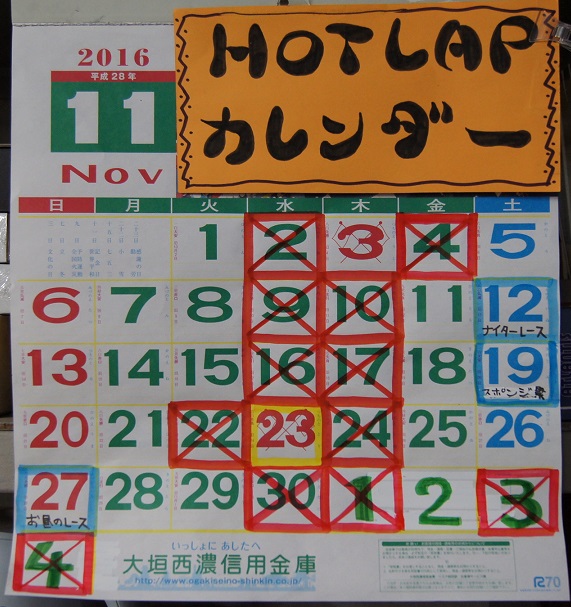 こんばんはー HOTLAPですー明日 11月27日 日曜日 お昼のレースがございますー早始まりの 早終わりで開催させていただきます9時半コースオープン 12時スタート5時前には 終了予定ですー今現在 下ピット けっこううまっています9時ちょいすぎには 2階もPITとしてあけますのでピットない場合 少々お待ち下さいませお昼のレース時 HOTLAP カフェは 6時半終わりお店 サーキットは 8時終わりでございますよろしくお願いいたしますでは また明日 よろしくね(^o^)丿