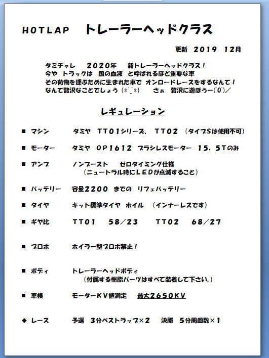 2020 新トレーラーヘッドクラス レギュレーション2019年 12月更新変更箇所ギヤ比が タミチャレGTと同じになりました (6.55:1以上)TT01 58/23 TT02 68/27 送信機(プロポ) ホイラー型プロポの使用を禁止にしましたくわしくはスタッフまで第二土曜日 HOTLAPナイターレース用の レギュレーションですよろしくお願い致します。