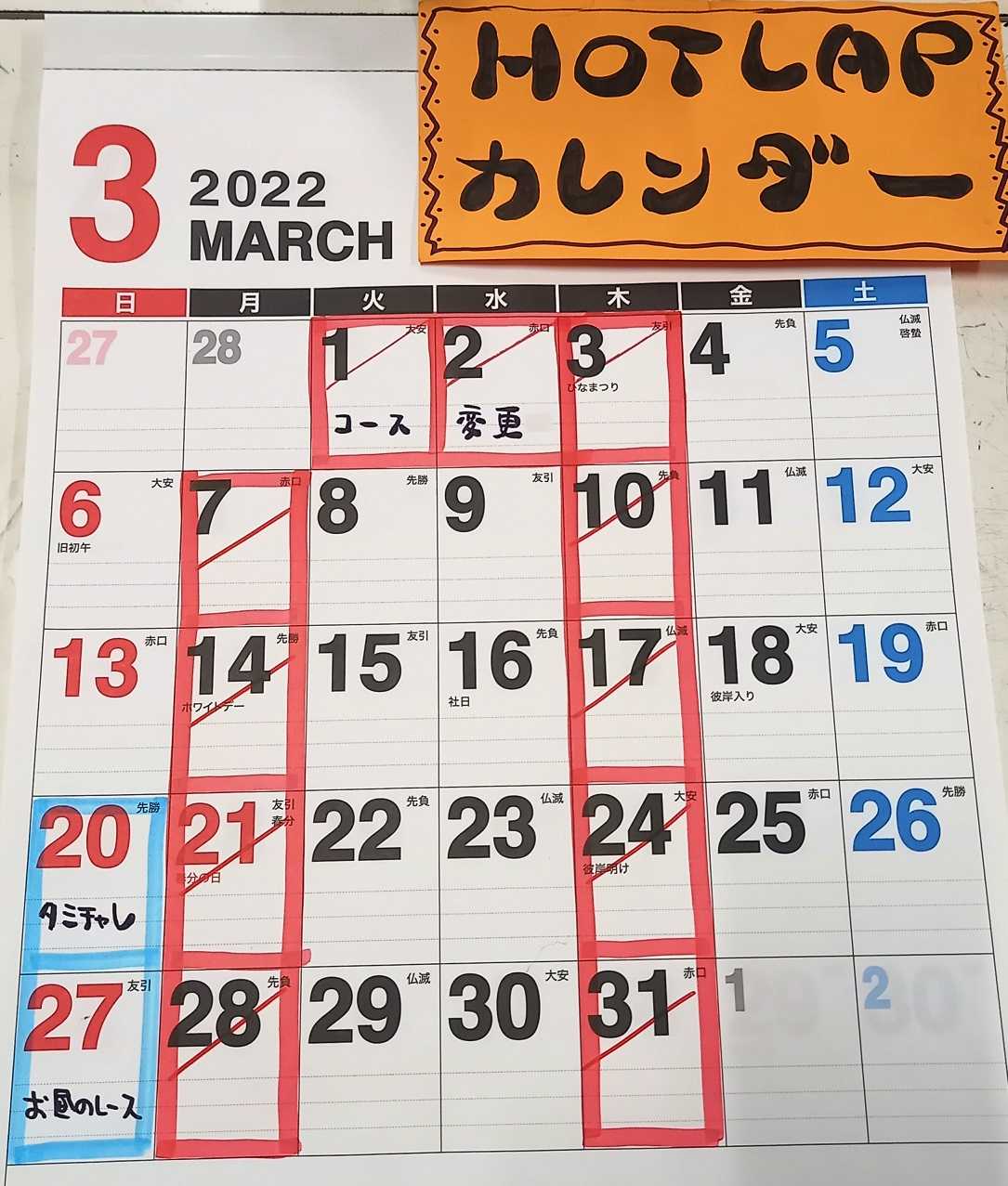 こんばんは HOTLAPですタミチャレを専用レイアウトで開催し そのままこそっとレイアウト変更作業にかかりましたが 全然時間たりませんでした(*_*;申し訳ないです 明日 あさって(1日 2日)お休みさせていただきます金曜日からよろしくお願いします すいません<(_ _)>では 3月のカレンダー 見てくださいねヤフーニュースで 3月6日までのまん延防止措置が東海3県 延長する方向というのを見ました ですのでレースは 中旬以降のお昼レースにしてみました20日 タミチャレ予定 27日お昼のレースの予定お昼のレースのカテゴリーはまだ決まっていませんが早めにきめますね すいませんでは 3月 暖かくなってきますね よろしくお願いします(*´з`)