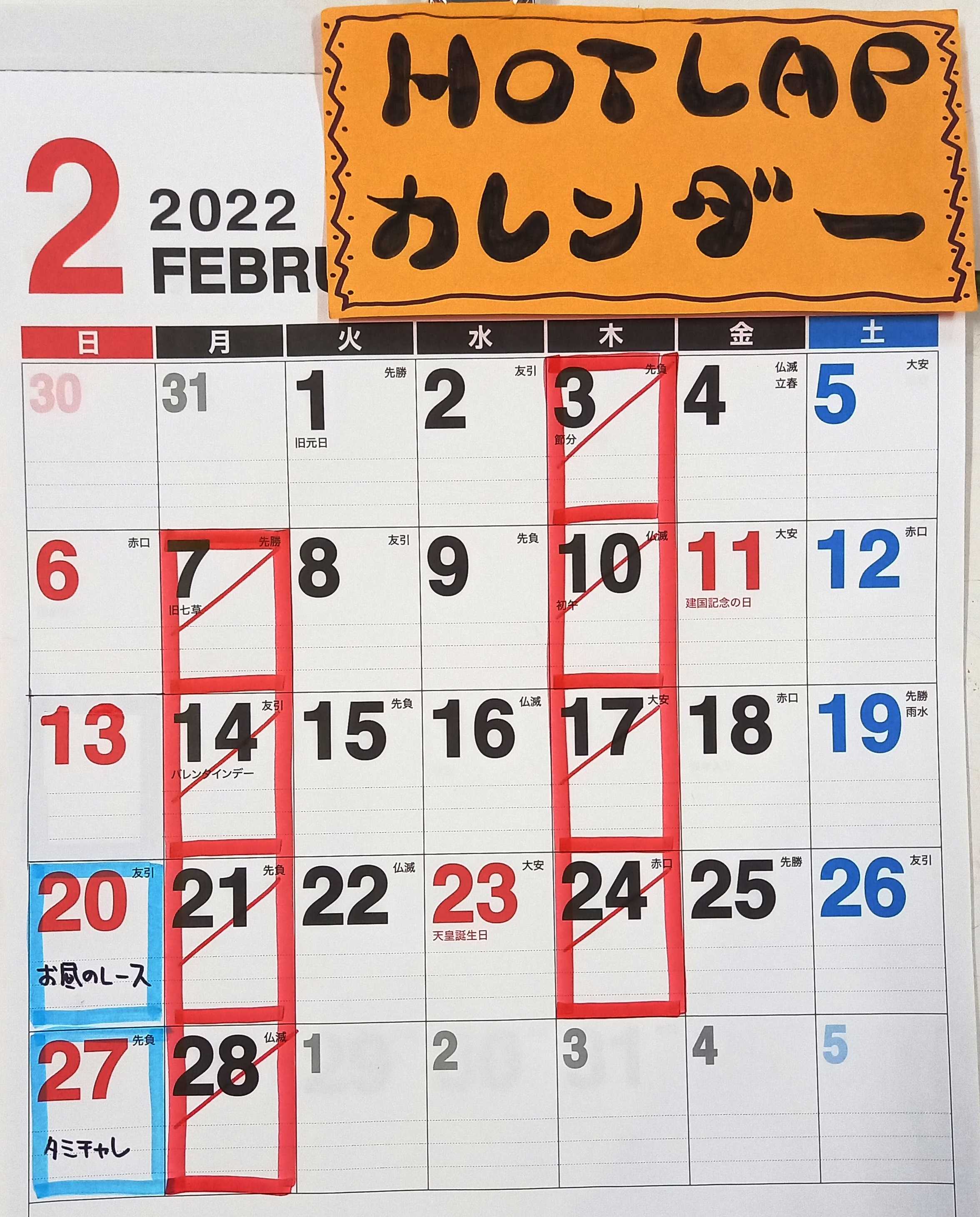 こんばんは HOTLAPですバタバタ1月が終わって 2月がはじまりました予定カレンダー 見てくださいね('ω')ノまん延防止による時短営業要請のため 解除されるまでの期間11時~20時までの営業体制をとらせていただいていますご協力していただき 誠にありがとうございます<(_ _)>20日(日) お昼のレース開催予定カテゴリーは 5つツーリングフレッシュマンクラス ツーリングノンブーストクラス1/12ストッククラス 1/12モデファイクラス と 復活 タミチャレトラック日曜日 空けておいてくださいね(^^♪27日(日) タミチャレ開催予定カテゴリーは 今回も5つ (さっと楽しんでさっと終わった方がよい時期かと思い少な目で)GT M TRFクラス ZEROビギナー ライダーです2022年レギュお時間 空けておいてくださいね(^^♪では 2月 よろしくお願いいたします