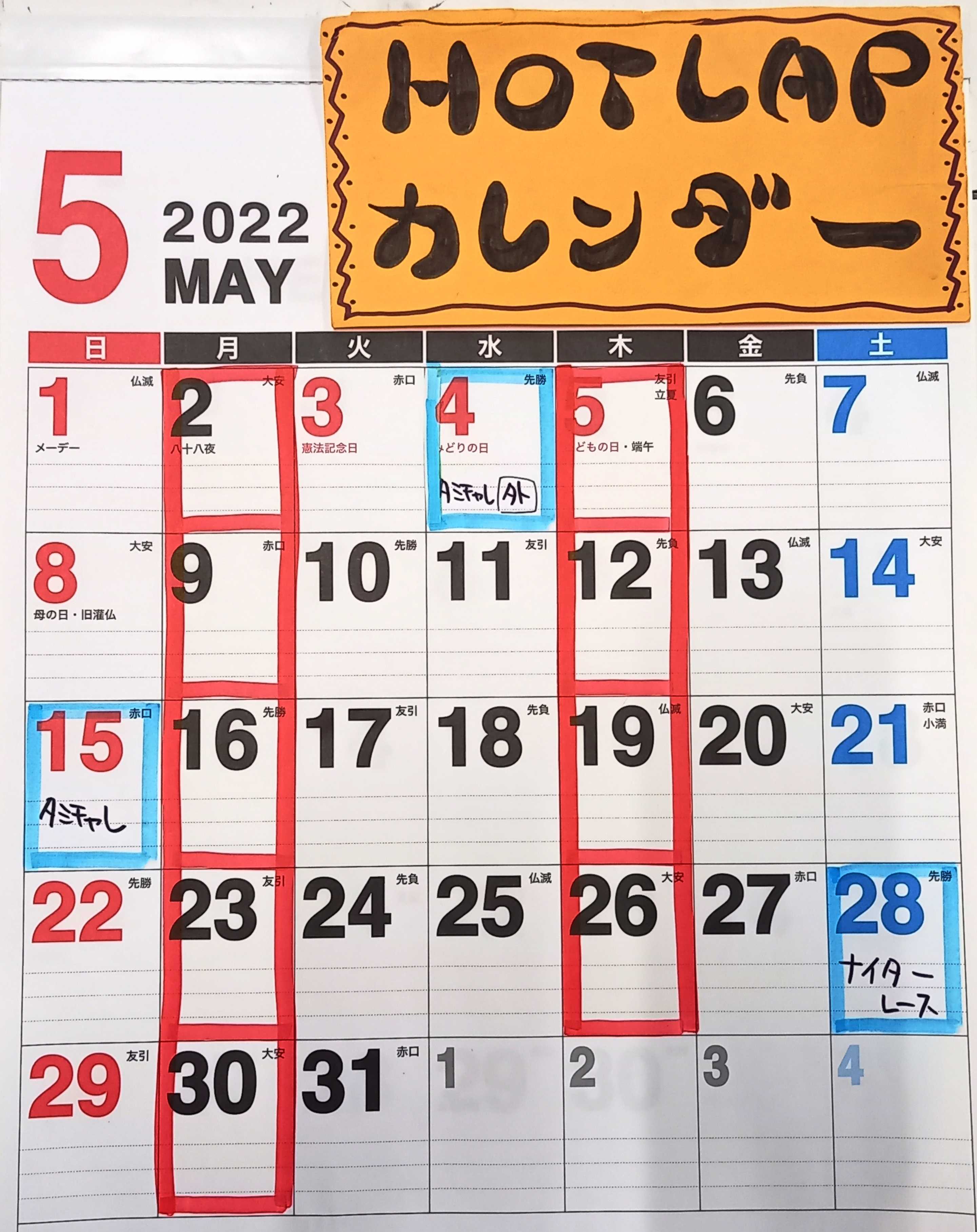 こんばんは HOTLAPです5月の予定カレンダー 見てくださいね('ω')ノ4日の詳細は ↓ リンクしてみました ポチっとしてみてね鋼商店タミチャレ よろしくねhttps://plaza.rakuten.co.jp/haganesyoten/15日(日)にタミチャレの開催を予定しましたカテゴリーは GT M ZERO ライダー トラックの5つでご予定 あけておいてくださいね('ω')ノ28日(土)にナイターレースやりましょうカテゴリーは 今回は3つフレッシュマンツーリング ノンブーツーリング 12ストック or 12GT でお時間 あけておいてくださいね('ω')ノゴールデンウィークもあります 5月 楽しんでいただけるようがんばります(^.^)