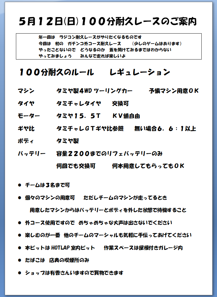 5月12日(日)に開催予定の 100分耐久レースのご案内をばまず 雨天中止です 土曜日の午前中に天気予報見て 日曜日の昼間の降水確率が70%以上あれば そこで中止を決めます で 日曜日は通常営業をさせていただきます皆様のご予定狂わしてしまうかもしれません すいません年1耐久レースイベントはラジコン屋で重要だよな と 今は思っていますポンダーが外ですので 10番までしかございませんお店のほうで先にエントリーはじめさせていただいて あと2チームとなりましたよろしければ お気軽にご連絡くださいおひとり様1500円 豪華くじ引きあります 優勝チーム 2位 3位に景品でます耐久レースがある場合 多分14時前には終わると思うのですが その後は閉店となりますお昼ご飯もございませんので 各自ご用意くださいませ雨予報や 雨の場合 ランチも 晩御飯もございますので よろしくお願いしますでは 天気予報とにらめっこしながら 週末まで過ごしていきますよろしくです(^_-)-☆