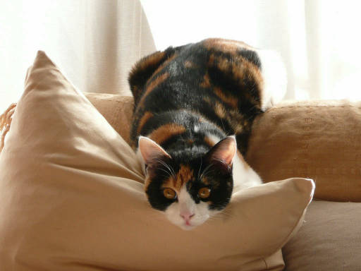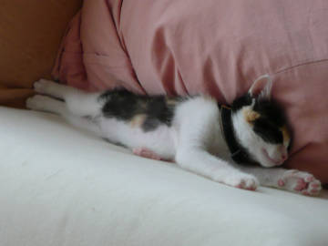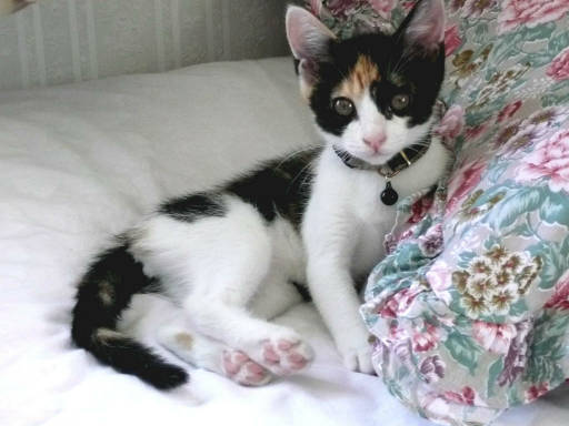 我が家に住まう猫、ミケを引き取ったのは、2007年7月7日、偶然にも「7」並びの日でした。その一月ほど前。知人が、道端で弱っている生後まもない子猫を見かねて、病院へ連れて行き看病しました。しかし家では既に飼っている先住猫がおり、一緒に飼う事ができないため引き取り先を探している。もし見つからなければ、やむを得ずまた放すしかないかも...そんな話を聞き、かねてから「もしも将来、飼うとしたら猫だよね」と、夫婦で話し合っていた我が家。予定は前倒しだけど、引き取ることに決めました。最初は風邪やら寄生虫やらで病院にかかりっぱなしでしたが、今はすくすく育っています。写真は、まだちいさかった頃の。全くじっとして居ないやんちゃなのに、少しおすまし顔です。