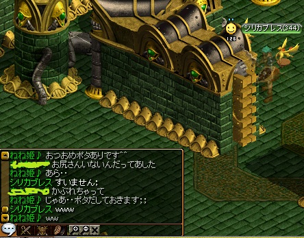 ぎるどだんじょんで夢にまでみた飛虎出ました!お兄さんと山分けです。おはようございます!お尻です!!!!日曜日ギル戦がありました。GOOD_FRIENDS_2のみなさま対戦ありがとうございました。最近しりかぶれのレベル上げをまさに鬼神のごとくやっとるわけですが新しく?もないかもしれないですが、せんとろーどで受けられるクエストで泣きました。こんなクエスト作りやがって!!チクショウ!!!涙で明日が・・すくり~んしょっともとりまくりだったんで貼っておきます。まずわたくしめの眼前に現われましたるこのお方微妙にとなりのと●ろを思わせるこのお名前。なんだかんだとくえすとを進めていきますと最後にNPCが・・・NPCのやろうが・・・!動きやがったんですよ!!><ここで泣きました・・・・んで最後によくよく画面をみたらF12をきもいくらい連打していた・・・と、そういうことです。文才が無くてこの感動は伝わらないかもしれませんが・・もういいんです;Å;もっと泣いてきます!さようなら!!シリカブレッス!!!サッ