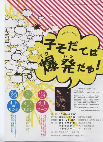 11月10日(土)~11日(日)レインボーハイランド(松山市野外活動センター)にてキャンプします!ナビゲーターは中ムラサトコ、ヤミーダンス、アトリエココの陽平くん最強タッグでお送りするHug育キャンプです!このイベントは国立青少年教育振興機構の「子ども夢基金助成活動」の助成をしてもらっております。後援:松山市教育委員会【スケジュール】オリエンテーションパフォーマンス&自己紹介レクリエーション昼食(持参のお弁当)音のピクニックいろいろ野外料理星空ごはんパーティロッジにて宿泊大自然の光と色を遊ぶクラフトワークショップほんわかランチタイム段ボール宮殿でお別れミニコンサート【参加費】大人4500円 子供(1歳~18歳)3500円(小学5年~子供だけの参加OK)【ナビゲーター】中ムラサトコ(ボイスパフォーマー、足踏みオルガン&太鼓奏者)ヤミーダンス(振付家ダンス集団)アトリエCOCO(三津浜でアトリエ展開)ワニナルアートカンパニーHug育(はぐはぐ)スタッフ【部分参加の料金表】(1)11月10日音のピクニック 大人500円、子ども1,000円 (小学生未満は保護者同伴)(2)野外料理と星空ごはん 大人1250円、子ども750円(3)ロッジに宿泊 大人1500円、子ども1,000円 (低学年未満は保護者同伴)(4)11月11日ダンボール宮殿 大人500円、子ども1,000円 (小学生未満は保護者同伴)(5)11月11日お昼ごはん 大人1,000円、子ども500円※(1)~(5)の参加できる部分の番号の参加料金をそれぞれ足して、部分参加の支払い参加費を計算してくださいませ。【申込】パンフレットに申込み様式がついております。メール・FAXにて受付こちらで参加表明いただきましたら折り返し連絡させていただきます。【問合】Hug育代表 池田美恵090-3785-7244Hug育(はぐはぐ)のFBもぜひご覧くださいhttp://www.facebook.com/matsuyamahughug