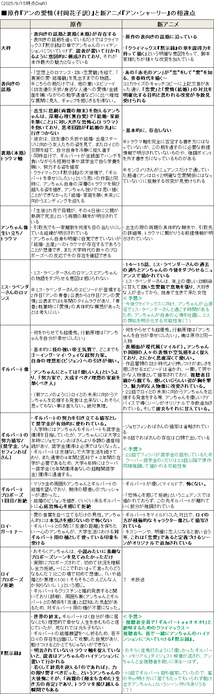 総括:アニメ『アン・シャーリー』と原作『アンの愛情』との相違点について