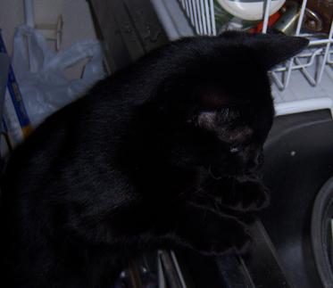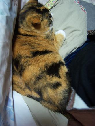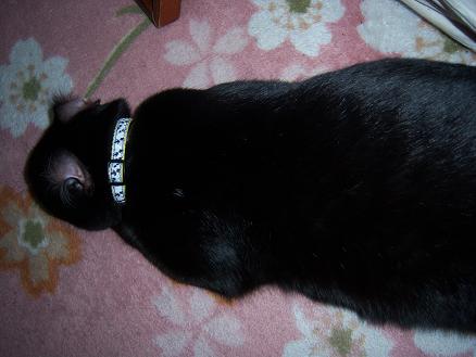 そんな折、ついに推定6ヶ月でにゃじ君が去勢致しました。日帰り手術で抜糸もなければ傷を舐めないためのパラボラも無し!傷がぴちっとくっついていて術後の煩わしさが全くないのです。動物の手術も進歩したものですね。術後のにゃじ君はうちに初めて来た頃のようにふわ~っとしていて撫で放題でした。「さあ!麻酔が抜けるまで撫で放題だ!!」などと人間は浮かれて普段全く撫でられないもんですからにゃじ君を撫でました。ぽや~~っとしてにゃじ君は何も気にしてなくてふわっふわしていました。「これだ!これが猫だ!!」などと人間達は叫んでいました。「麻酔のせいなのか? 男の子じゃなくなったからなのか?」「今日だけなのか? これからも穏やかな猫なのか?」などと推論したりしました。夜になると動物病院のスタッフさんからにゃじ君の体調を確認する電話が来ました。ほほぉ~~今はそんなサービスもしてくれるんだと驚きました。その日もの静かな猫だったにゃじ君はやはり翌日にはいつも通りの好奇心満々の活発過ぎる猫に戻っていました。にゃじ君はよく玄関の靴箱の下に走り込んで誰彼なく脅かしたり、階段の下で狙っていたり、廊下のドアの陰に隠れていたりします。あまりに活発で危険なためにゃじ君は家から出さない事にしたのですが何しろ黒いので闇に紛れどこにいるのか全く分からないんです。俊敏なので予測が付かず捕まえる事も出来ないんです。人間が外出する時も玄関ドアを開けるのが不安になります。俊敏な上に超活発なのでドアの隙間から外に逃げたら外では長生き出来そうもない気がするからです。それで居場所を確認するためにも首に小さな鈴を付けました。始めは首輪を外そうと面白い動きで暴れていましたが細かい事は気にしない性格なのですぐに慣れました。今では家のあちらこちらでチリチリ♪音がするのでああ、今はあの辺で遊んでいる今度はこの辺にいると分かるようになり大分安心できるようになりました。そんなにゃじ君は足の裏をいじられても平気です。耳がひっくり返っても平気です。ピーに両耳をひっくり返されてもそのままずっと寝ています。細かい事は気にしないにゃじ君は去勢手術後に局部を気にした事はなく痛み止めを1錠も飲まなかったくらいです。全く野生的で可笑しな猫です。そんな極端な3匹の猫との慌しく忙しい毎日です。