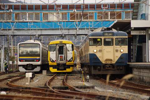 寒いっ三連休は関東南部でも雪が降るそうだね内房線で 快速おいでよ房総物語号 が走る予定だというのに観光客が一足早い春を楽しみにわざわざ房総まで来て雪に降られたら気の毒だわせっかく SLばんえつ物語号のレトロ客車が房総まで出張してきてくれるんだしおだやかな天気になるといいんだけど安房鴨川駅内房線ホームで出発を待つ113系とお昼寝中の209系&特急わかしお113系113編成この写真撮ってるあいだも足や手の先が冷えきって辛かったブルブル