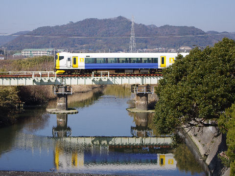 待崎川を渡るわかしお外房線・安房鴨川駅をでて一つ目の鉄橋遠くに見える緑色の屋根の建物はこの春から使われる中学校の校舎川にうつるわかしおを撮りたかったけど水面が揺れてイマイチな仕上がりに