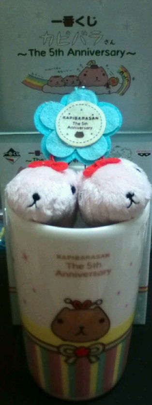 またまた一番くじに挑戦。「 一番くじカピバラさん~The 5th Anniversary~」2日で2回なのでいつもよりは我慢した(え?)H賞ぬいぐるみマスコットは「仔いわいさん」にしてみましたで、G賞陶磁器タンブラーはなんかめでたい感じのを。なんか、HPによると「ご当地限定カピバラさん」なるものが発売されるらしいすでに4月に発売されたのが↓らしいけど、可愛い~ 今後が楽しみです。ハイウェイ限定「れっつご~ん ハイウェイバス」温泉地限定「ウットリ・・・温泉」