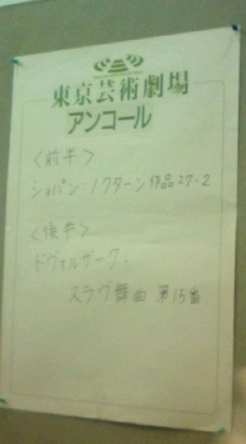 東京芸術劇場に行ってまいりました。指揮:レオシュ・スワロフスキーピアノ:辻井伸行ドヴォルザーク:序曲「謝肉祭」Op.92ショパン:ピアノ協奏曲 第1番 ホ短調 Op.11ブラームス:交響曲 第1番 ハ短調 Op.68アンコール辻井伸行・・・ショパン:ノクターン 作品27-2スロヴァキア・フィルハーモニー管弦楽団・・・ドヴォルザーク:スラヴ舞曲 第15番3階の一番上の列だったんですけど、初めて聴く、生の辻井伸行くんのピアノ・・・好きな曲だからってのもあってか、もう本当に素敵でした。なんだろう・・・あのキラキラした感じ技術的にどうかとか詳しくはわかりませんけど、とにかく好きだから仕方ない。やっぱりピアノだけのも聴きたいかも・・・でもピアノ協奏曲 第1番、ますます大好きになりました。オケもピアノも。スロヴァキア・フィルハーモニー管弦楽団も、もちろん初聴きなんですが、1曲目の謝肉祭は、なんかイマイチの印象で・・・2曲目からは私には違って聴こえてすごく良くって、3曲目もアンコール曲もほんといい感じで。疲れから、寝ちゃうかも・・・と思ってたんだけど、全然大丈夫でした!中学・高校とピッコロ(とフルート極少々)をやっていたこともあり、どうしてもピッコロとフルートパートを見てしまうというか聴いてしまうというか。私、今吹けるんだろうか?とか考えたりして懐かしかったです。ここにいるのは、ほんとうに極めた方達なんだなぁ・・・としみじみクラシックもやっぱりいいな~