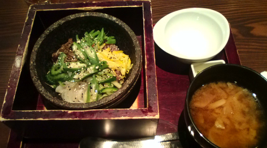 やさい家めいの「彩り野菜八目の石焼ビビンバ御膳」をランチでいただきました。ビビンバとしては辛さがない分、ちょっと物足りない気もするし、ちょっと油っぽすぎる感じもあったけど、ごま油がおいしくってただ・・・カウンターが高すぎて石焼ビビンバ鍋の中が覗けなかったり、かなり肘というか肩をあげないと混ぜたりよそったりもできないし、(この写真も、立ち上がるのもな~って思って画面見ずに頭より上から撮影)野菜汁のお椀が大きすぎて持ちにくくて、ほんと食べにくかった・・・汁もぬるかったし。厨房の私語もかなり筒抜けだし、ホールの人達も私語多いし、人が食べてる椅子二つあけた席のカウンターの拭き掃除を始めて、カウンターの壁の部分を台ふきで拭うのに、私のほうに向かってスナップきかせるから、台ふきの風がくるんですよ・・・ありえなくないですか?客が3組しかいない広い店内で、その客の近くで掃除するのもなんだかな~って思いますけど。「ありがとうございました~」とかいう挨拶とか気持ちよさげな接客ではありましたが、メニューとしては他にも食べたいものはあるけど、二度目はないかなって感じです。せっかくおいしい野菜食べるのに、気持ちよく食べたいので。以前、このお店と同じフロアのお店に入った時も残念な感じだったけど、このビルとは相性悪いんだな~きっと。