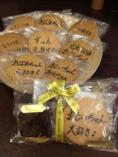 こんばんは!もうすぐ敬老の日がやってきますね大好きなおじいちゃん、おばあちゃんにいつもありがとうの気持ちを伝えませんか??そこでイチリンでは只今、「敬老の日ギフト」¥600を販売しております「おじいちゃん いつもありがとう」「おばあちゃん いつまでもお元気で」「元気100倍 おじいちゃん」などなど、パティシエがこのクッキー達を貰ったおじいちゃん、おばあちゃんの顔を想像しながら、一生懸命作りました!!数量限定ですのでお早めにお待ちしております!
