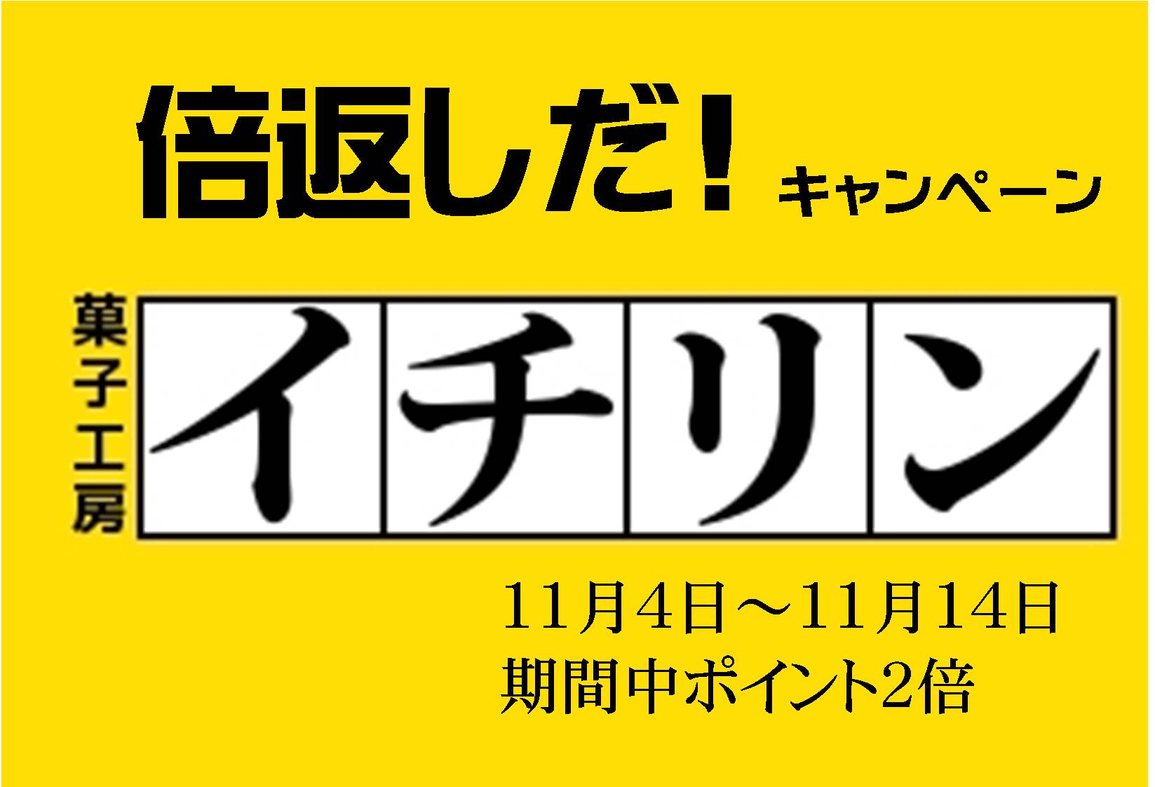 こんばんわ!いきなりですが、イチリンにはメンバーズカードがあるんですが、皆さまご存知でしょうか・・・??このカードは、入会金100円でご入会頂けて、525円で1ポイント付きます。期限は、最終ご利用日から一年なので、一年以内にご利用があればどんどん伸びていきます!「近くなので良く来るんです」「このケーキがすきで良く来るから」等とたくさんの会員様がいらっしゃいますいつもありがとうございます今回、会員様へお得な情報です!!!その名も「倍返しだ!!」キャンペーーン!!あのーーーー、それは・・・笑そうです。いいたかったのです・・・11月4日から11月14日の10日間限定で。ポイントが2倍になりますお得ですねこのメンバーズカードはいつでもご登録頂けますので持っていない方もその日に作れますので、店頭スタッフにお気軽にお声掛けください
