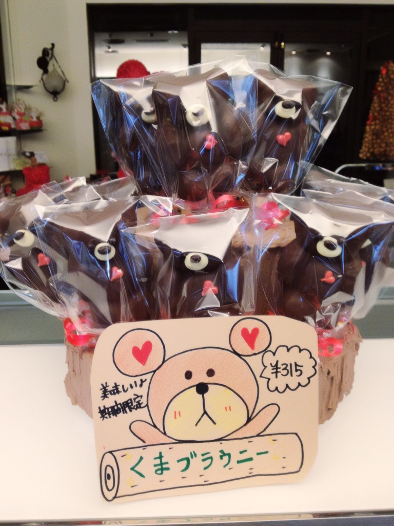 こんにちわまだまだ寒いですねみなさんは何ケーキがお好きですか??質問がおかしいかも知れませんが、私は冬になるとやっぱりチョコレートが食べたくなります夏はマンゴーやオレンジなどさっぱりしたケーキがおいしく感じるのでそんな寒い今の時期にぴったりなクマさんチョコブラウニーが登場しましたこの見た目も可愛い!チョコのブラウニーの上にチョコをかけた、チョコレートが美味しいいまの時期限定ですスティックタイプで食べやすいですし可愛いし美味しくて、私はひとつ食べてまた食べたくなってついまた食べてしまいました笑お友達にプレゼントにも。自分へのおやつにも。可愛くて食べるのが少しもったいなく感じてしまうクマさんに会いにきてくださいね