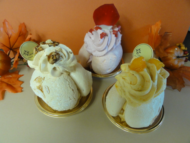 ムラング・シャンティー・キャラメルポワール(左)香ばしいメレンゲとキャラメル生クリームで中には洋ナシが!!ムラング・シャンティー・アラ・ローズ(中)メレンゲにバラの生クリーム、バラと木イチゴのジャム入りムラング・シャンティー・アブリコ(右)サクサクのメレンゲでアプリコットクリームをサンドし、中にもアプリコットが入ってます バラのケーキのクリームが美味しくて個人的に一番オススメです!! 敬老の日用に焼き菓子ギフトをご用意させていただいてますので配送などもできますのでよろしければご利用ください。