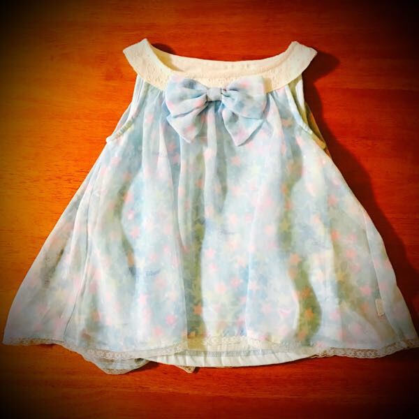 メゾピアノのリボンつきシフォンチュニック、110サックスを99センチの娘が着ています。