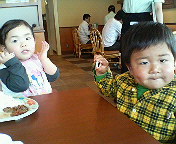 今日は100円ショップに行ってからいとこのに遊びにいった。昼にランチバイキング行くけど一緒に行く??って言われてせらぽんと私も参加やった~~突然のランチそれもおごりで嬉しいなぁ。。。。せらぽんは小4のお姉ちゃんと年長のお兄ちゃんに遊んでもらえるからすごく嬉しそう兄弟みたいでしょ!! ばーばの姉(大ばーば)に買ってもらったよ。バイキングではみんなを驚かせるほど食べたせらぽん。一人で黙々と食べ続け『上手に食べるな』と褒められたよ帰りはもちろんお昼寝(mー_ー)m.。o○ zZZZ今日は3時からDPTの予防接種。もうすぐ寝てるけど、車に乗せて行かなくては・・・ヽ(≧Д≦)ノ ウワァァン!! だろうな・・・・