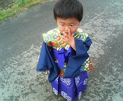 昨日の昼から今日のお稚児さんの準備や衣装合わせで超忙しい日々が過ぎていきました今日は待ちに待ったお稚児さんの日お稚児さんて、お寺の行事で子供たちが決まった衣装をつけて顔にマロのような化粧をし行列をしてそのお寺まで歩くもの。詳しいことは、はっきりは分からないけど、私の地域では3回すると縁起がいいんだってせらぽんも小さいながら85cmの衣装を借りて参加しました。衣装も嫌がらず袖を通してくれてよかった。むしろ気にいっているみたい頭に付けるのは落ちてくるのでやめました。鼻ほじほじ!!檀家さんの家からお寺まで1,4キロぐらいの道のり・・・ここをみんなで行列160人ぐらいの子とその親多数。。スタートして1分周りが大きい子ばかりで恐くなったのか 抱っこ抱っこえ~~~ココから抱っこまだまだ先は長いのに・・・重たい途中で歩いたり抱っこしたりしながらもうすぐお寺。。。仕事帰りのパパが待っていてくれて交代。もうすぐ終わりじゃないか・・・じーじや小ばーばも観に来てくれていてそこからは最後までがんばって歩いたせらぽん。。だってすごいカメラでグズグズ言ってる場合じゃない1歳児ながら結構な距離を歩いたせらぽん。ママとお手てつないでがんばったね。もっとグズグズ言うかと思ったけどたくさんの人が大好きなので楽しく参加できましたお寺でお土産にお菓子、数珠、お花、和尚さんが1人10枚しか持っていないカード(貴重らしい)いただきました我が家の一代イベント こうして終わっていきました。