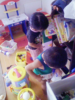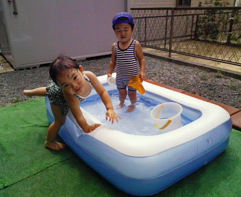 今日はママ友達と遊びました。といっても、どんぐりで先日会ったNちゃんとRちゃん。どんぐりから帰ってきて、、「N、R、プー、マンマね~~、ネンネね~~」としつこいのです。わからないので通訳「NちゃんとRちゃんと一緒にプールして、ご飯食べて、お昼ねしたかった。」です。わかったよ。メールしたろ・・・というわけで今日になりました。今日はNちゃんところでプール10時にいつものスーパーで待ち合わせてお昼ごはん買ってからへ・・・駐車場にプール用意してもらってあって服のまま入ろうと・・・まだまだ!!お昼ごはんを冷蔵庫に入れて、さあ着替えって、部屋のおもちゃで遊んでる((●≧艸≦)プププッ もう忘れた???早すぎ~~~~~(*ノω