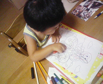 雨の降る中、、、従姉が赤ちゃんと共に実家に帰っているので遊びに行ってきました夏休み中の子供たちもいてせらぽんはいっぱい遊んでもらいました。『ねーね。。にーに。。』って、行く時から楽しみにしていたんだ。。赤ちゃんが気になって、何回もベットに見に行ったり手をたたいて振り向いてもらおうとしたり・・・せらぽんなりにお兄ちゃんらしく接していました。触り方とかもソ~~~トで・・・だけど、突然何するかわからないからヒヤヒヤも広くて走ったり、ゴロゴロしたりお姉ちゃんたちと汗だくになって楽しい゚+。:.゚ヽ(*´∀`)ノ゚.:。+゚ 子供同士ってホント楽しそうに遊ぶ・・・遊んでもらってる(●>ω<●) みんなで昼ご飯いつも二人だけどみんなで(*)´ー`(*)”モグモグ おいしいねもちろんお昼寝の時間なんで、、、みんなで寝る真似してたけど・・・せらぽんが全く寝るきなしで一人騒いでいた・・・そりゃ、もったいなくて寝れないかそして、一人抜け、二人抜け、、、結局誰も寝かせることなく3時ぐらいになりせらぽんは、ようやく力尽きた(;´Д`A ``` 夕方になったので帰ってきてからカレーを作って、、、その間せらぽんは、アンパンマンの塗り絵してました。いっぱい遊んでもらったので、一人でおしゃべりしながらジロジロしていました十分遊んだ日は、一人でいっぱい遊べるんだよね。。しばらくして、、、鼻をくんくんどうやら、カレーの匂いがしたようだ!!『ママ~~マンマ~~』「よ~~し、食べよう夏野菜カレーだよ~~」