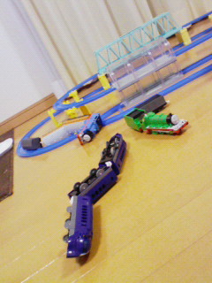 今日は久しぶりにNちゃんとRちゃんKくんとあそびました。Kくんの弟が産まれてこっちに帰ってきたから赤ちゃん見せてもらいました。Kくんに会うのも半年ぶりでかなり大きくなっていて言葉も達者で同級生とは思えませんでした。せらぽんも「Kくん」って言えないので『にーに』と呼んでました。いやいやヾ(  ̄▽)ゞ 同級生だから・・・久しぶりにあったらみんな以前とは違う。取り合いしたり、話したり、笑いあったりみんな大きく成長してました。ほほえましい(*´∀`*)ゞ 朝9時に起きたせらぽんは昼寝もせず、いつもで持つか。。早く夕飯食べて、お風呂入って寝かせないとね(●>ω<●) 帰ってきてからプラレールで遊んでます。本物がこんなことになったら大変だよね