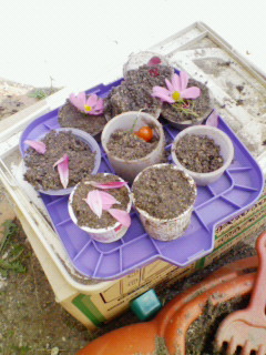 夏に活躍したプールも終わり、今は砂遊びに夢中のせらぽんです。驚くことに夏前よりもはるかに楽しい遊びができていて一緒に遊んでいる私も楽しんでます。自分の誕生日を祝ってもらったのも最近の話なのでケーキを作ったり、プリン、ゼリー私にはコーヒーを作ってくれます。自分の身近な経験を遊びに変えて遊べるようになりました。今日は、、、のせてみたら・・・って言うとじゃーん(*´∀`*)ゞ !!!お花のケーキやトマトのケーキを作りました。ちょっとのアドバイスでココまで出来るとは思わなかったな~~。で、『ケーキ食べたいな』って言うと、「あめ(ダメ)あっちゅい。」『熱いの??じゃあ、フーフーして食べるから貸して』「あめ。。。」『・・・』結局作った綺麗なケーキは一回も食べれず・・・自分も食べずにおぼんに入れて大事にしてました。もったいないから食べられなかったんだろうな・・・今も砂場にしまってあるよ((●≧艸≦)プププッ