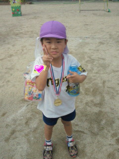 今日はせらぽんの幼稚園の運動会。昨夜は今日のことを考えると、不安であまり眠れず・・・朝になりました。せらぽんが1番に起きてきました。そらまめは今日の朝がバタバタするのをわかってるかのように、遅くまで寝ていてくれました。行く前になり「行きたくない」って一応言ってせらぽん車にスタスタと自分から乗り込み出発。幼稚園では、うまく離れられるか心配だったけど、何とかバイバイできてホッとして座る席に移動。。オープニング体操かけっこリズム親子競技×2いつも終わると私たちの方を見てるかチェックしながらも全部やり終えることができました。今年はいろんな気持ちが入り交ざって最後まで出来るかハラハラしたけど無事に終わってそれだけで満足してます。せらぽんがんばった。金メダル~~~H22年度運動会来年はいよいよ年長。自分の持ってる力全部出せるといいな。
