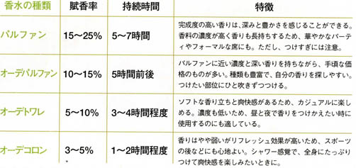 ・賦香率  香水は、香料、蒸留水、アルコールで構成されていますが、その中にどのくらいの割合(濃度)で香料が含まれているかを示すもの。