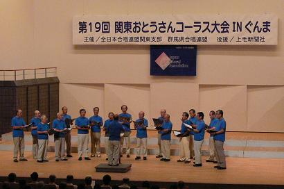 【お父さんコーラス大会で歌う】 7月26日(土)12時30分から、第19回関東お父さんコーラス大会が、全日本合唱連盟関東支部と群馬県合唱連盟の主催、上毛新聞社の後援で、群馬県藤岡市のみかぼみらい館大ホールで開かれました。 我々アンサンブル・レオーネからは18人が参加し、34団体に混じって「剣の舞」(グノー作曲)を歌ってきました。 暑い暑い一日でしたが、毎年参加している演奏会で、他の多くの男声合唱団の演奏を聴くことができて、参考になりました。 お父さんコーラスの詳細は → お父さんコーラス詳細版 をご参照ください。