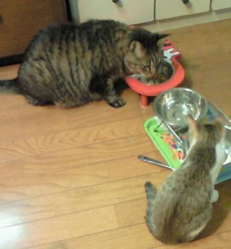 【 仲良くごはん 】 ここに来て、急にマゴが静かになりました。今日はショコラとモナカが、一緒に仲良く、ご飯を食べたようです。 ほっとしました。やっと仲良く過ごすことができるようになったようです。 もう、大丈夫でしょう・・・。 今更ですが、ショコラと言えば、バロンなど生まれた子猫5匹の世話を、親替わりにやっていました。 おしっこの面倒など、他の猫では考えられません。 親猫がいないと、5匹の赤ちゃんはショコラのおっぱいに吸い付いていたものです。それを嫌がりもせずに受け入れていたショコラは、“猫の鏡”的な存在です。 これはショコラの親が、子育てが面倒になってきて、いなくなることが多かったせいもあると思います。 マゴが静かであれば、ショコラも静かです。 ショコラの傷が完治するのも、もう少しとなってきました。