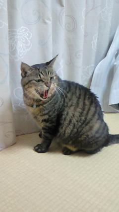 【怒ったショコラ】 外で喧嘩をしてきた傷がなかなか完治しないで、外に出られないショコラは、ストレスがたまってイライラしています。 そこに、新しい住人のモナカ(通称“マゴ”)が、遊びたくてつきまとうため、イライラは一層つのります。 いつもは仏様のようにいい顔をしています(?)が、最近はイライラしている時にこんな顔をします。 「たまには顔の筋肉の運動になって、エエンデないの?」 と私が言ってます。 ショコラの前脚はほとんど、ビッコをひかないで歩けるようになりましたが、まだ、完治していません。 猫の歯は鋭く尖っていて、関節部分に突き刺さったようです。毎日、固形の薬を飲んでいますが、もう少しで治りそうです。