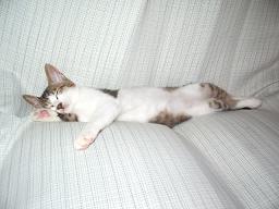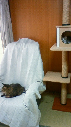 【ソファーで熟睡するまごさん】 まごさんが1階でショコラと合流して3日が過ぎました。まごさんは1階での生活にすっかり慣れて、もう、あまり2階に上がってこなくなりました。 2階に上がると、奥の部屋に閉じ込められるとでも思っているのでしょうか・・・。1階での生活に満足したまごさんは、ほとんどなき声をあげることがありません。 寝る場所も全く自由で、どこで寝てもいいのです。キャットタワーの中段で寝たり、かごの中に入って寝たり、・・・と、寝場所を決めるのに迷ってしまいそうです。 2階で私がパソコンをやっていたら、眠そうな目をして近くにやってきて、結局、机の隣に置いてあるソファーに長くなって寝てしまいました。 寝る子は育つ!! のは、人間だけでなく、猫も同じ???
