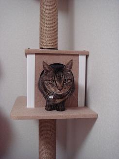 【どれ、わしも入ってみるか】 最近、我が家はショコラ、まごで、てんやわんやの騒ぎになっています。ショコラが脱走して、右手の傷の状況が少し悪くなりました。台所の窓から下に飛び降りましたが、2mぐらいあるので、びっこの右足にはよくなかったのではないかと思われます。 ショコラが外に出られる日は、また少し延期となりました。ショコラは家の中にいても、外に出たがって、しょっちゅうないています。 すると、せっかく寝ていたマゴも起きてしまって、部屋の中でなきはじめます。 全く、騒々しい毎日となっています。 今日の昼間に、少し退屈しのぎに、ショコラをキャットタワーに載せてみたそうです。丸い窓も、ショコラでは、お腹が通るのがぎりぎりです。出られなくなっては困りますが、なんとか出られたようです。