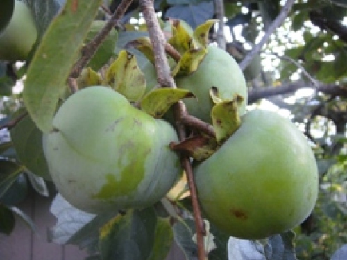 【下を向いた柿の枝】 猛暑の中で柿の実がしっかり育ってきました。今年は例年より たくさん実がついて、その実の重さに枝がしなり、ついに枝は 下を向いてしまいました。 涼しい風が吹く頃には、大きな黄色い実に育っていると思います。 柿の実が育つに連れて枝しなり ついに下向き熟れるのを待つ