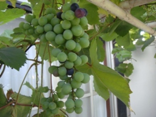 【軒下のブドウ】 6~7月の2度の台風で、ブドウの木がかなり傷めつけられましたが、 なんとか育ってきました。よく見ると雉鳩(きじばと)が巣を作っていた あたりの房の青い実が、少しづつ色づきはじめました。 どんな気象条件が影響したのかよく分りませんが、今年は1回消毒 しただけで、虫がほとんど付きませんでした。 雉鳩が巣作り子供飛び発った ブドウの棚の青い実色づく
