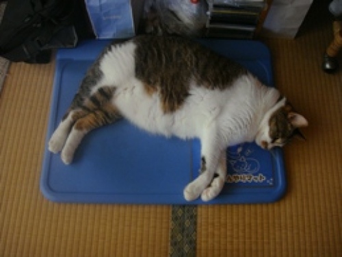 【ひんやりマットで寝るマゴさん】 手で触れるとひんやり冷たく感じる猫用マットです。かつてショコラが 乗ってよく寝ていましたが、マゴさんは横目で見るだけで、乗ったことも ありませんでした。 ここにきて、ベローンと横になって寝ています。 冷たくて気持ちいいのが分ったか・・・。 猫用の触れると冷たく気持ちいい ひんやりマットで横になり寝る