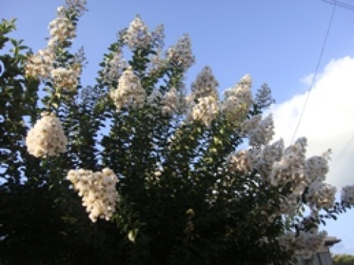 【庭の白い百日紅】 庭に白い百日紅の花がたくさん咲いています。毎日の猛暑を ものともせず、青空の下で咲き誇っているようです。 お盆も過ぎて、そろそろ、涼しい風が欲しいところです。 次々に花が開いて百日間 どこかで咲いてる百日紅の花 木登りの上手(うま)い猿でさえ登れないそんな諺(ことわざ)猿が怒りそう
