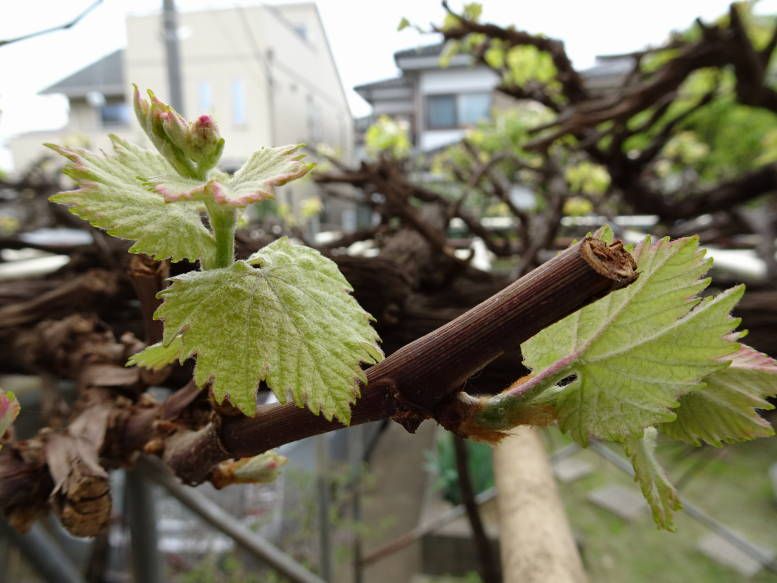 例年より二十日遅れのブドウの芽 連休前のそよ風に揺れる