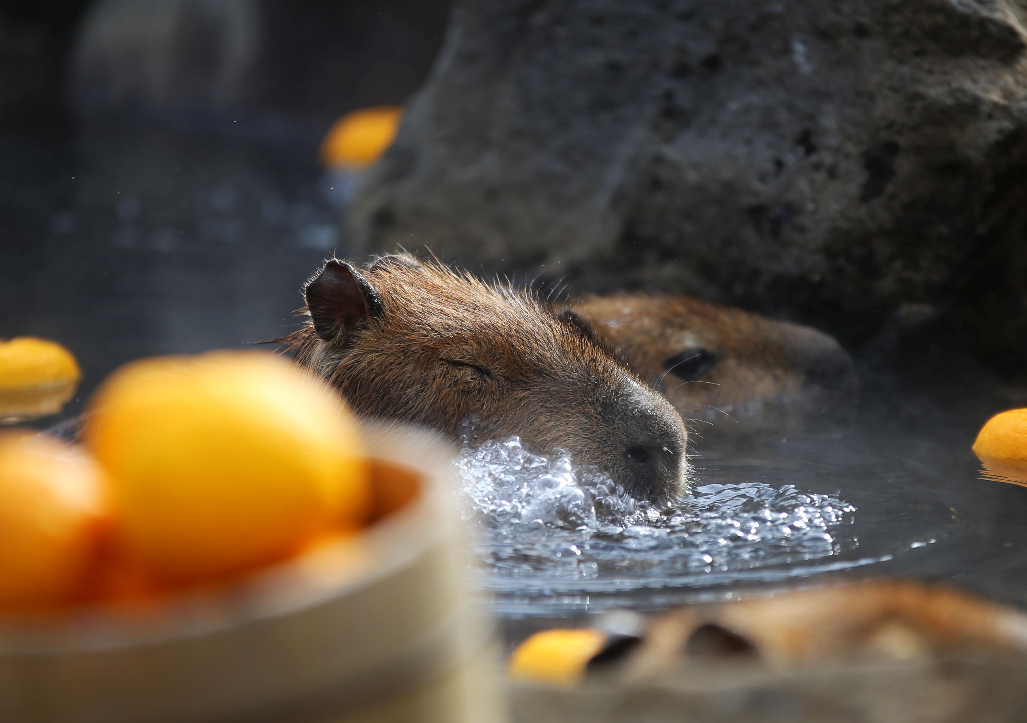 入浴するカピバラ。
