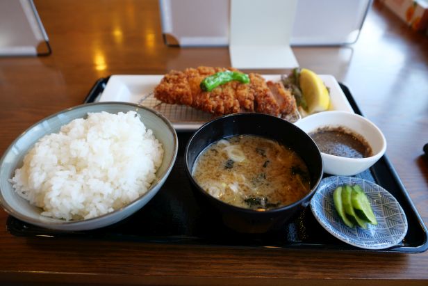 天照石湯 で入浴した後、すぐとなりの みゆきの六方 で、みゆきポーク(飯山の豚肉)のとんかつ定食。