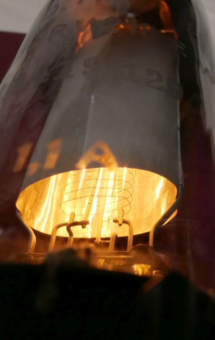 フィラメントを点灯すると、グリッドがらせん状に巻いてあるのがよくわかります。