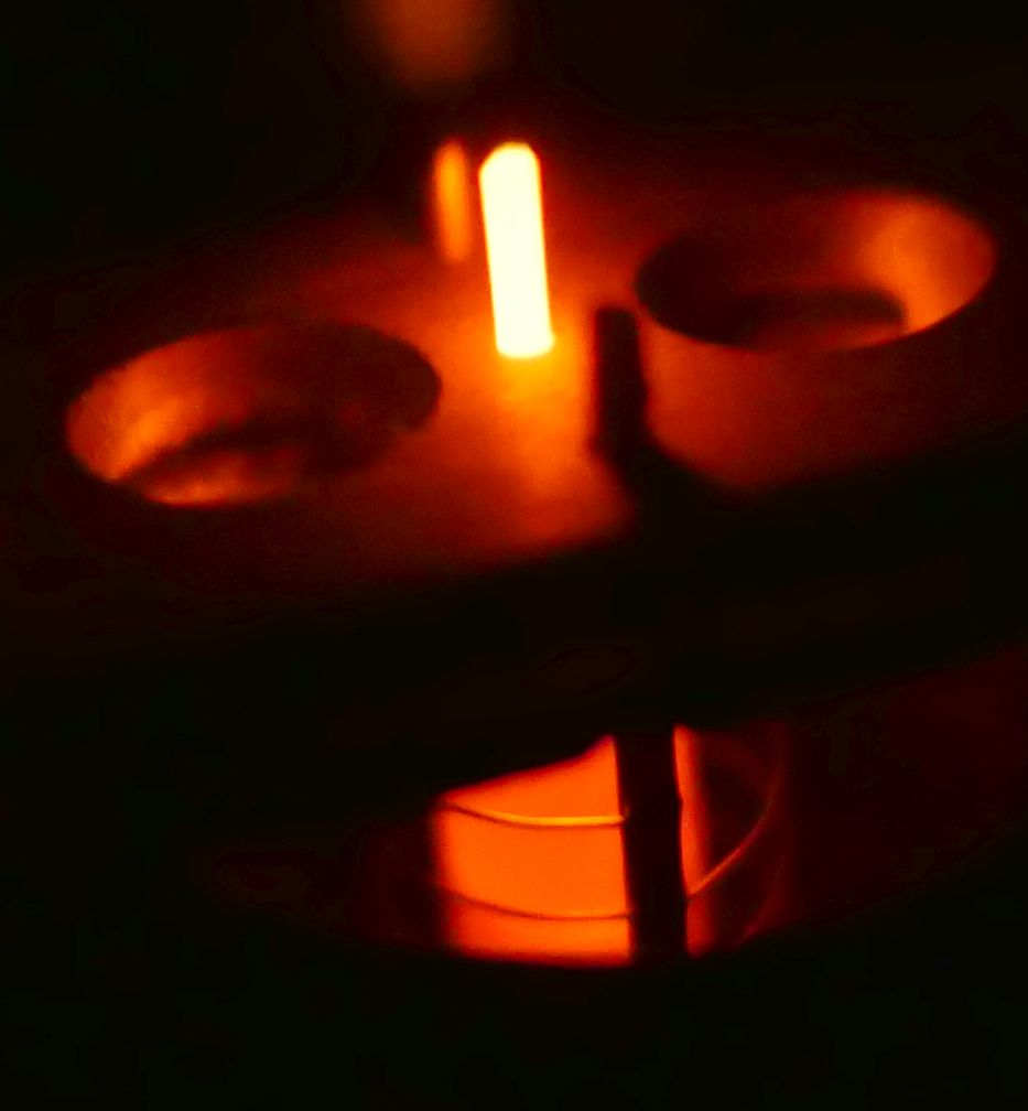 奥に鈍いオレンジ色に光る太いカソードが見えます。